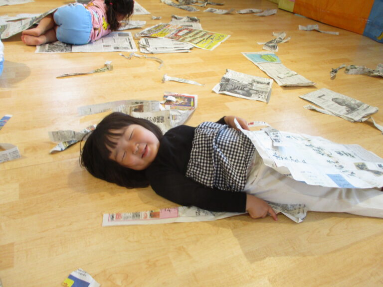 みんなで新聞遊びの日。新聞っていろんなものに変身するんだよ~! ほら、私のお布団!「おやすみなさい」