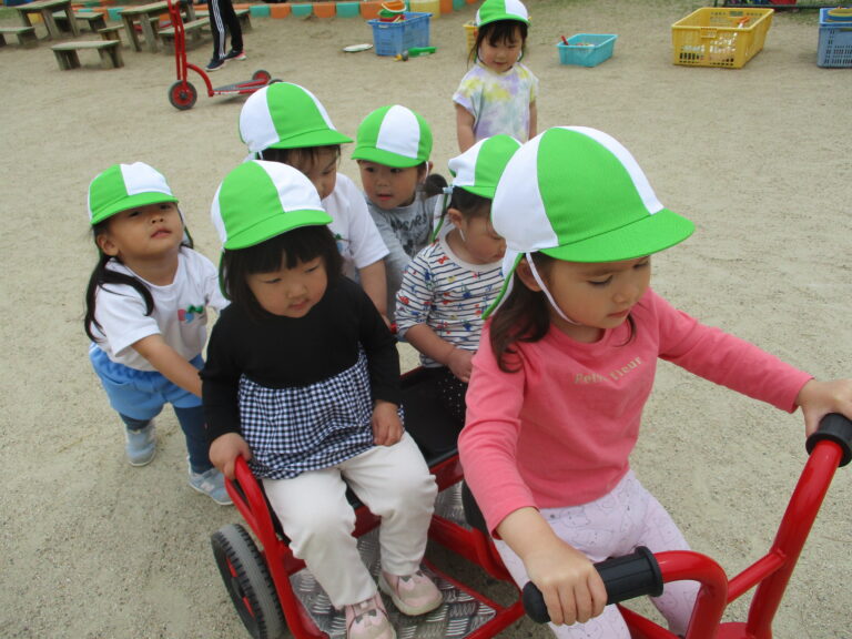 タクシー三輪車は子どもたちから大人気! 「みんな~乗った?」「ぼくは後ろから押すね!」