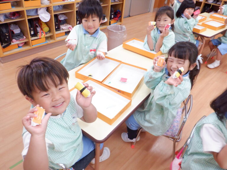 今度、赤組のみんなでお店屋さんごっこをするんだよ! 僕たちのクラスはお寿司屋さん!