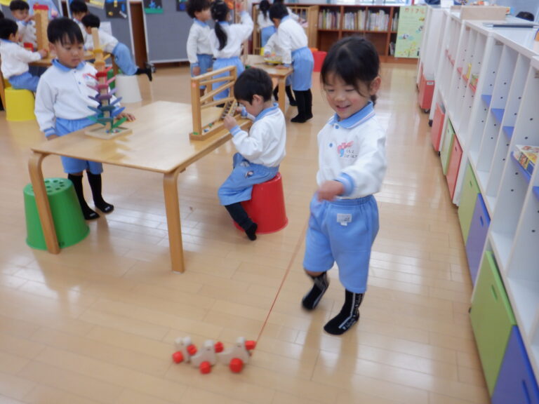 入園・進級し園生活にも慣れた子ども達、定期的に保育室のおもちゃだけでなく短大実習室・幼稚園内の各多目的室へ行き、いろいろなおもちゃで遊びました。