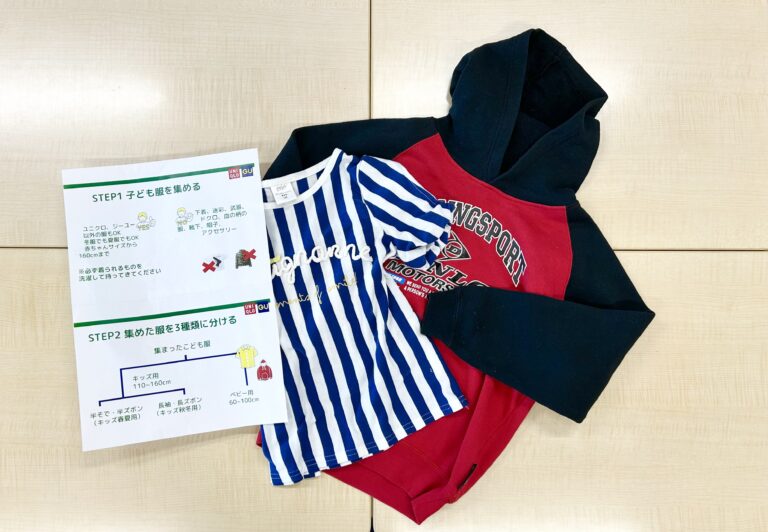 子どもの頃に着ていた、もう着られなくなった服を回収、リサイクルし 難民の方など服を必要としている方のもとへ届けられます。