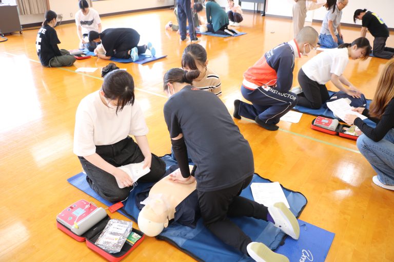 毎年、日本赤十字社大阪府支部柏原地区・柏原市と連携し、救急法講習を実施。基礎~救急員養成までを学び、認定証の取得も可能です。